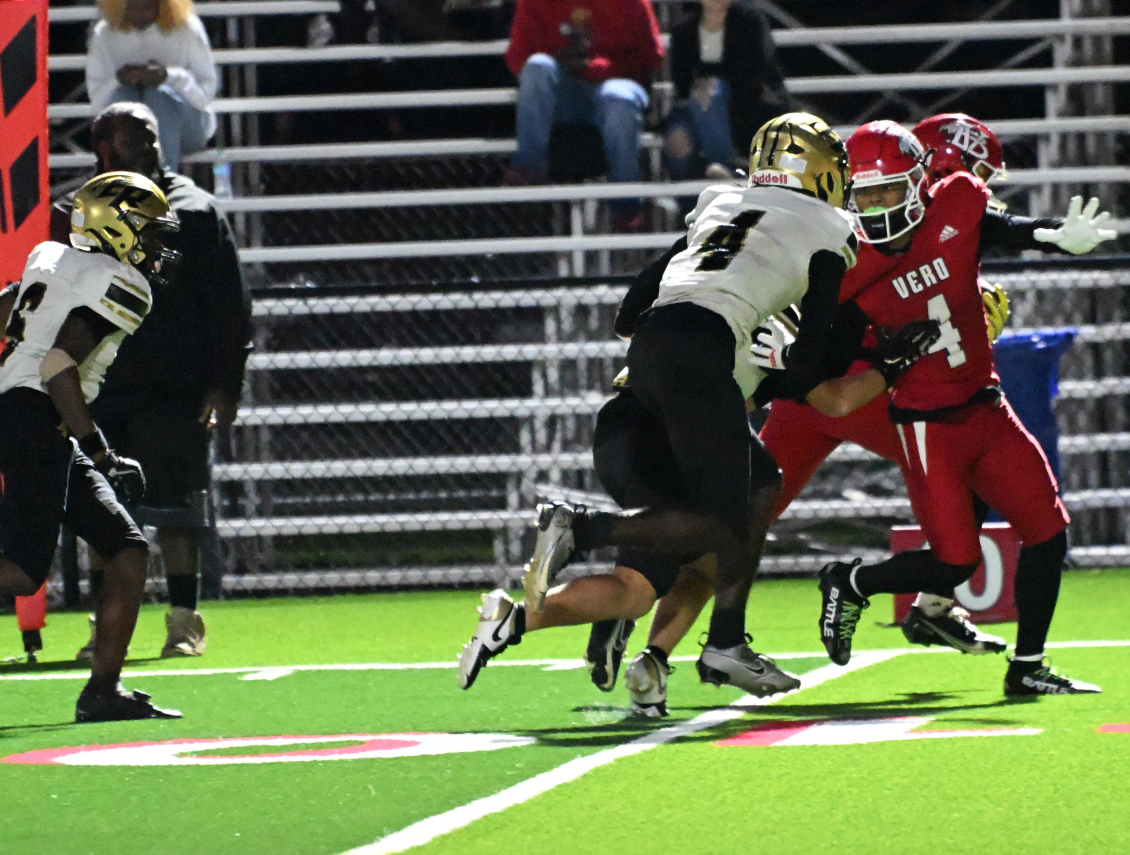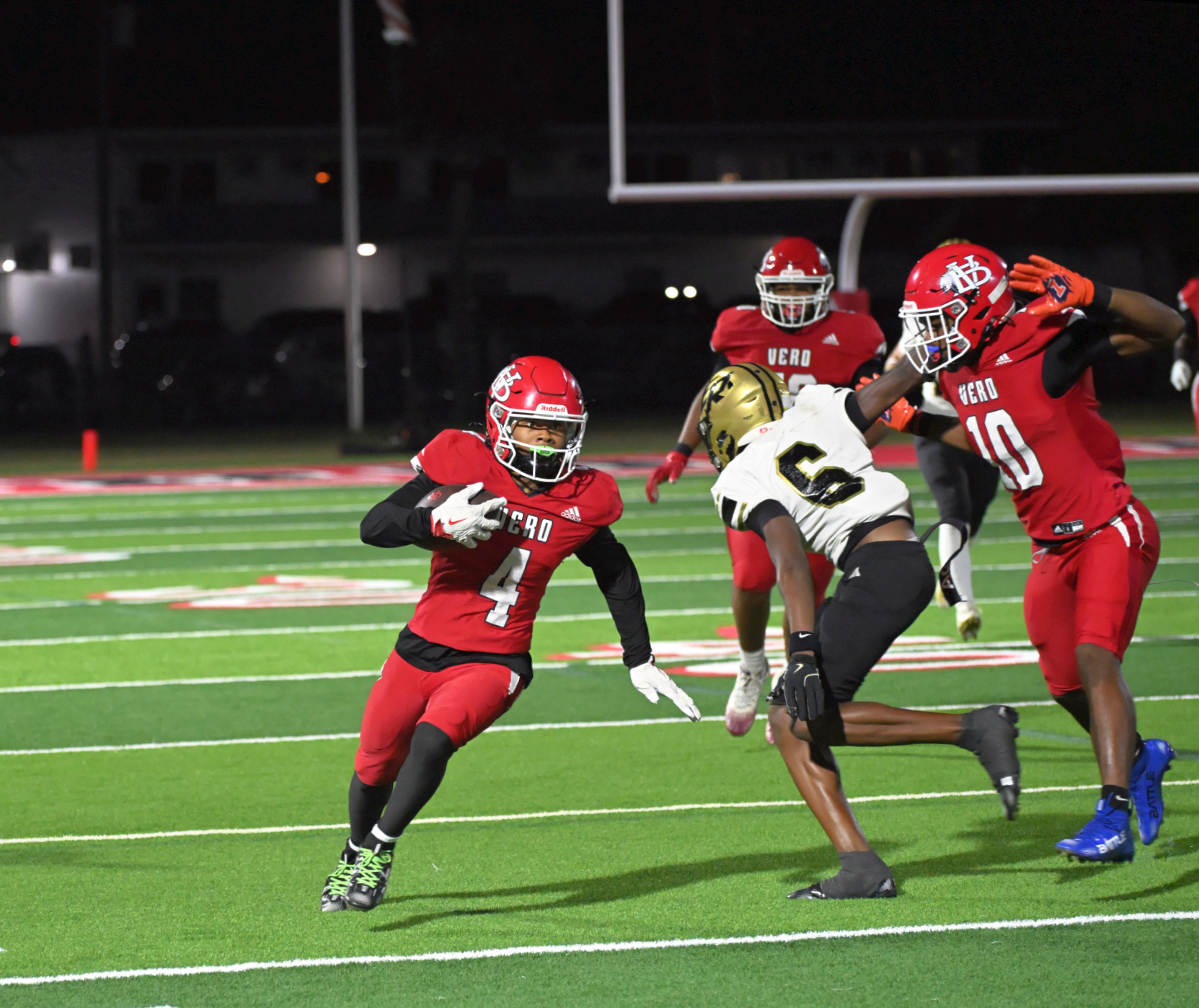   Vero Beach receiving: Sophomore wideout #4 Lat Woods led all receivers, pulling in eight receptions for 108 yards and two scores, giving Vero a consistent big-play threat.