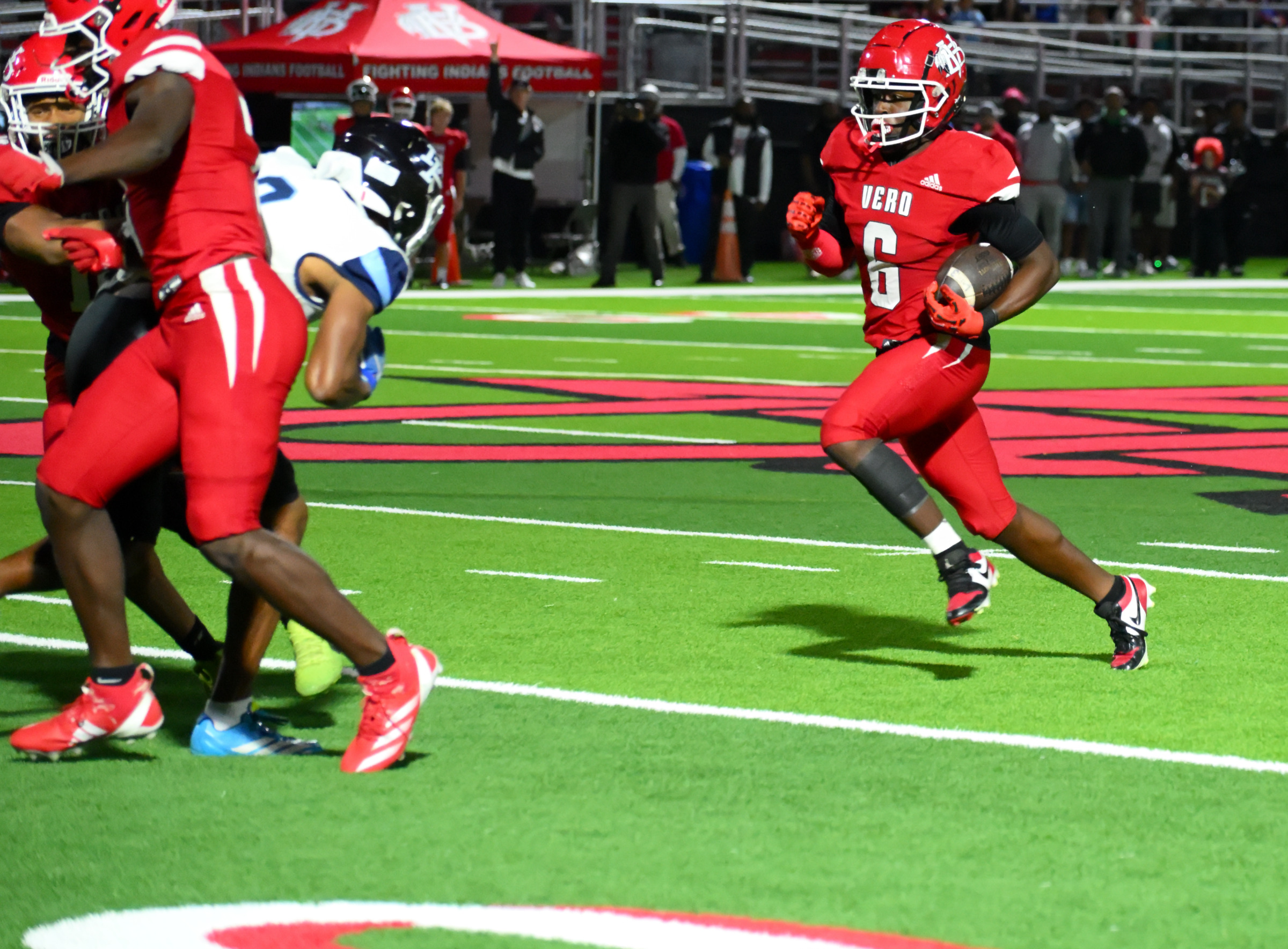 Traveon stiff armed his way down to the 15 yard line behind his blockers. Vero Beach Football Class 7a Playoffs November 28, 2025.